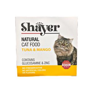 کنسرو گربه ۱۱۰ گرمی با طعم انبه و ماهی تن Shayer Tuna and Mango، مناسب برای تمامی گربه ها است. انرژی لازم برای فعالیت روزانه را تامین میکند، این محصول با طعم ماهی تن و انبه در ژله میباشد. کمک به افزایش هوش و سلامت مغز. به درمان زخمهای به وجود آمده کمک میکند.
